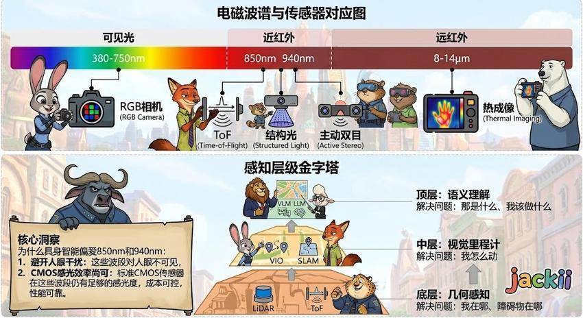 被动感知(如单目、双目):像人眼一样,不发射能量,仅接收环境光。隐蔽性好,功耗低,无多机干扰,但极度依赖环境光照和纹理。主动感知(如LiDAR、ToF、结构光):像蝙蝠一样,向环境发射能量(激光、红外光)并接收回波。精度高,不受光照影响(除非阳光过强导致饱和),但存在功耗高、多机干扰和材质吸收问题。
