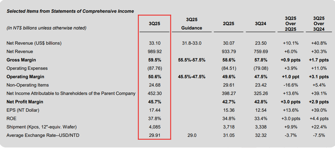 周四,台积电公布第三季度财报,具体来看: